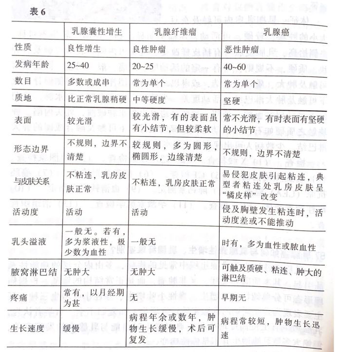 乳腺囊性增生是乳腺组织中常见的疾病,多由内分泌的功能性紊 乱引起,其本质既非炎症,又非肿瘤,而是正常结构的错乱。根据病 理形态可分单纯性小叶增生、囊性小叶增生、腺性小叶增生三种。其 主要表现为月经周期的乳腺实质过度增生,而复归不全。有学者认为, 乳腺增生有上皮高度增生与不典型增生时可能与乳腺癌的发病有关, 但绝大多数乳腺增生并不是癌前病变。 乳腺纤维瘤是年青妇女常见的良性肿瘤,好发于 15—35岁,高峰 为 20—25岁。纤维瘤的病因尚不完全清楚,但大多认为与激素平衡 调有关。临床上多无特殊症状,常在自检或普查中发现乳房肿块。 般缓慢增大,少数可能增大较快。 以上两种常见疾病多因乳房可触及肿块而被怀疑为乳腺癌,此时 应进一步做相关检查以明确性质。现将三者的主要区别列表如下,以 供参考。